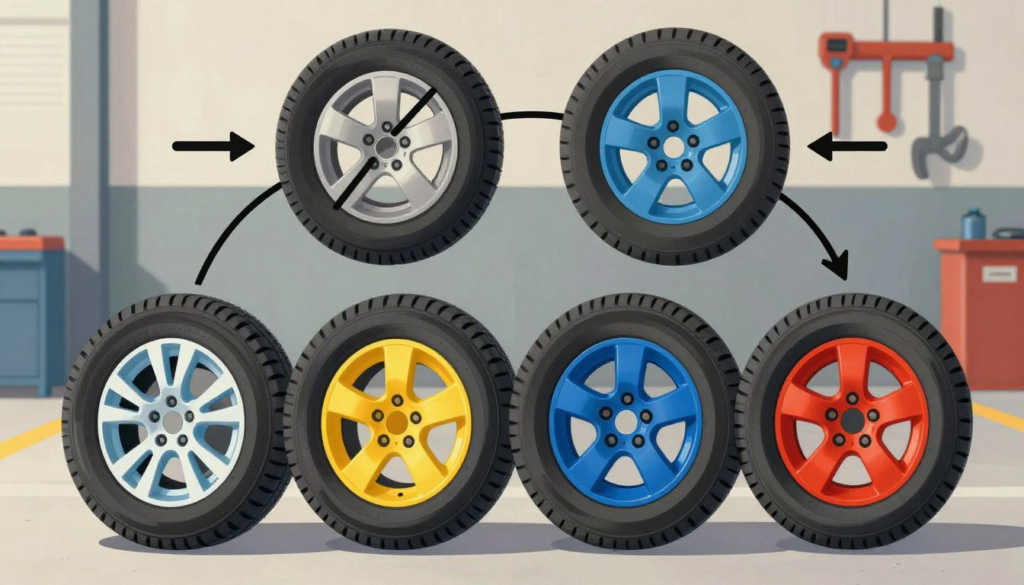| Directional tires (arrow on sidewall) | Front-to-Rear (same side) | FL → RL, FR → RR (no crossing unless remounted) |